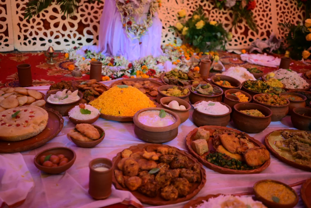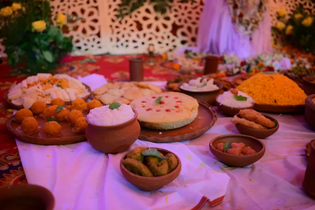 As the offerings are made, devotional singing and chanting continue in the background, creating a sanctified and joyful atmosphere. The altar becomes a divine spectacle adorned with vibrant dishes and flowers. After the offering ceremony, the Bhog is transformed into Prasad—sacred food blessed by the Lord—and joyfully distributed to all attendees.