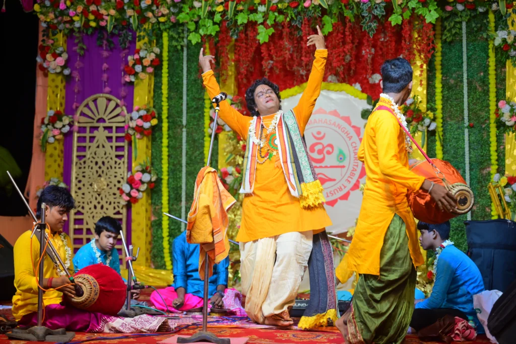 Led by celebrated kirtan groups and devotional artists, the Sankirtan begins in the evening and continues late into the night, drawing in hundreds of devotees from all walks of life. The atmosphere is filled with energy, love, and devotion as the sacred names of Lord Krishna are sung with rhythm, passion, and deep bhakti. The melodious sounds of mridangas, kartals, harmoniums, and cymbals blend with the powerful voices of kirtan leaders, creating a transcendent vibration that touches the hearts of everyone present.